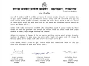जिला कांग्रेस कमेटी बाड़मेर, बालोतरा और जैसलमेर के पदाधिकारियों की ओर से जारी लेटर में कहा गया है कि यह पोस्टर अज्ञात व्यक्तियों द्वारा लगाए गए हैं और पार्टी संगठन का इससे कोई लेना-देना नहीं है।