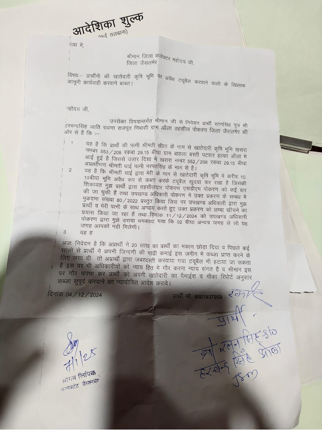 Jaisalmer : जैसलमेर की पोकरण तहसील के ओला गांव में एक किसान की खातेदारी कृषि जमीन पर अवैध कब्जा करने का आरोप है. गांव निवासी रतन सिंह का कहना है कि उनकी पत्नी सीता के नाम से खातेदारी कृषि भूमि है जिसके पड़ोस में धाई पत्नी नरपतसिंह के नाम से खसरा है. उनका आरोप है कि धाई ने उनकी पत्नी की कृषि भूमि पर कब्जा करके अवैध ट्यूबवेल करवा लिया है.